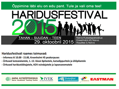 29 октября 2015 года в Нарвском профессиональном учебном центре пройдет Фестиваль образования «Обучение на протяжении жизни – вклад в успех. Выбери свой путь!». На фестивале будет присутствовать консультант Фонда интеграции и миграции «Наши люди», а в рамках мероприятия пройдут два семинара т.н. «Языкового кафе» на тему веб-среды Keeleklikk.