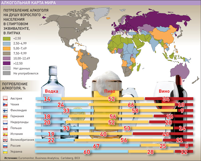 Первое место досталось Литве, где среднестатистический гражданин выпивает 14 литров спиртного в год на втором месте оказались Австрия, а замыкает первую четверку Чехия. В двух этих странах, как и в Эстонии потребление алкоголя составляет 11-12 литров.