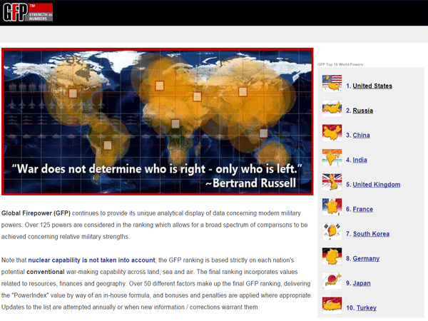Впрочем, насколько аутентично составлен рейтинг, это еще большой вопрос. Так, например, эксперты поставили оборонную мощь Кубы ниже Эстонии, на 110 место, хотя у кубинской армии 50 танков, 1830 БМП, 100 установок РСЗО и свыше 80 самолетов, в том числе боевых истребителей, перехватчиков, а также 4 ударных вертолета.