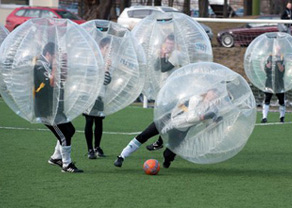Пафбол - это забавный аналог футбола, который отличается от оригинала в основном тем, что тело игрока находится в пластиковом шаре, от которого остаются свободными только ноги. Пожалуй, зрелище такого матча может носить пока в основном развлекательный характер, потому что серьезно болеть, когда на поле сталкиваются и падают настоящие мячики в человеческий рост, практически невозможно. Зато такие падения абсолютно безопасны для самих игроков, благодаря окружающему их тело шарику.
