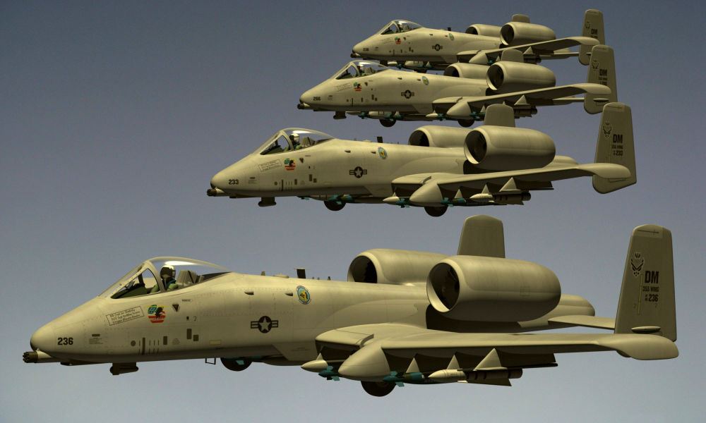Предназначенный для нападения на наземные мишени и оказания поддержки сухопутным войскам одноместный штурмовой самолет A-10 Thunderbolt II знаменит своей маневренностью, значительной огневой силой и сравнительно тихой работой моторов. Самолеты входят в состав 303-й эскадрильи истребителей США, дислоцированной на авиабазе Уайтмен в штате Миссури.