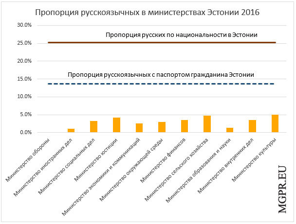 Как следует из данных за 2016 год, ни одно министерство не имеет долю русскоязычных работников, равную доле русского национального меньшинства Эстонии, которое составляет 13,6 процента населения страны, не говоря уже об общей доли русских по национальности в Эстонии, составляющих 25,2 процента: