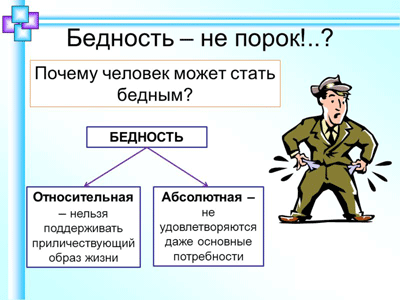 Напомним, что социологи разделяют абсолютную и относительную бедность. Под абсолютной бедностью понимается такое состояние, при котором индивид на свой доход не способен удовлетворить даже базисные потребности в пище, жилище, одежде, тепле, или способен удовлетворить только минимальные потребности, обеспечивающие биологическую выживаемость. Численным критерием в данном случае выступает порог бедности (прожиточный минимум в государстве). Под относительной бедностью понимается невозможность поддерживать уровень приличествующей жизни или некоторый стандарт жизни, принятый в обществе.