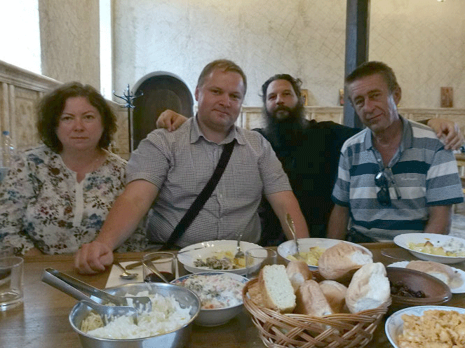 На фото из Facebook Родиона Денисова: Вера Кремез, Родион Денисов, проректор Призренской духовной семинарии отец Андрей и Юрий Алексеев.