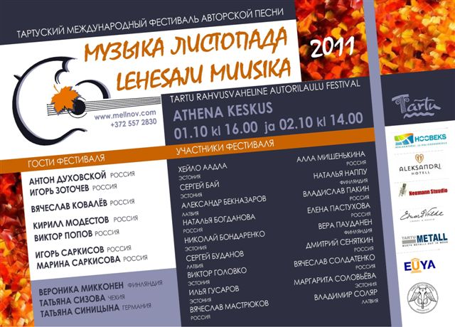1 и 2 октября в Тарту пройдет уже второй международный фестиваль авторской песни "Музыка Листопада 2011". В кинозале центра «Атэена» выступят участники и гости из Эстонии, Латвии, Финляндии, России, Чехии и Германии.