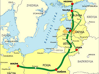 Представительный международный форум, который будет проходить 5 октября в Таллине, будет посвящен проблемам транспортного сообщения Эстонии с Европой. На конференции "Хельсинки-Таллин Euregio", организованной управой Харьюского Уезда Эстонии, в числе других вопросов будут обсуждаться также перспективы развития железнодорожной магистрали Rail Baltic (на фото карта маршрута).