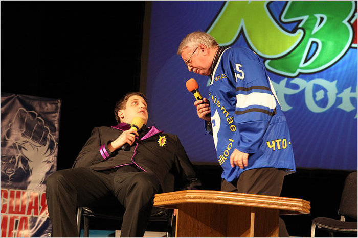 Милиционерам из Луганска, знакомым нашему зрителю под названием «Другой мир», особенно хорошо удавались шутки на тему их профессии. Наверняка всем запомнилась социальная реклама про бабушек, торгующих семечками на остановках, которых в природе осталось всего 30, потому что сейчас все покупают семечки в пачках. А у семечек в пачках, как утверждает команда, нет души. Приглашенной звездой «Другого мира» стал главный редактор еженедельника «МК-Эстония» Андрей Титов. Он зажег в этот вечер лучше всех «звезд». За несколько минут на сцене он успел и спеть, и станцевать легендарный танец под песню «Thriller» Майкла Джексона. Конечно, «лунная дорожка» была не идеальна, но для журналиста – очень даже круто.