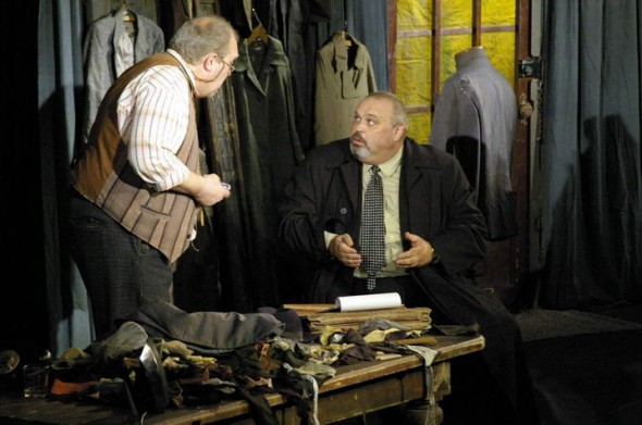 «Интервью» - это разговор по душам, разговор со зрителем, который невольно становится соучастником драмы. Спектакль камерный, нужен близкий контакт с человеком, поэтому он всегда идет только на Малой сцене. Действие разворачивается в маленьком ателье между портным и страховым агентом. Агент, который пришел сделать простую проверку, невольно выворачивает всю жизнь несчастного портного наизнанку, интервью превращается в настоящий допрос, который длится весь спектакль. Драматизм зашкаливает, впечатляет игра актеров, особенно психологические приемы внушения, которые действуют и на зрителя.