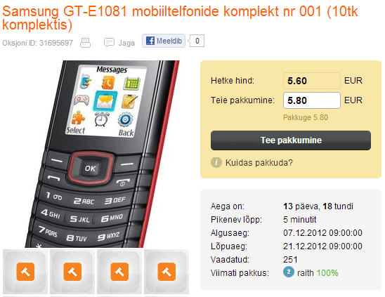 Всего будет продано 720 использованных мобильных телефонов Samsung GT-E1081. Телефоны продаются в комплектах из 10 телефонов, начальная цена каждого комплекта 5 евро. Принять участие в торгах до 21 декабря 2012 года