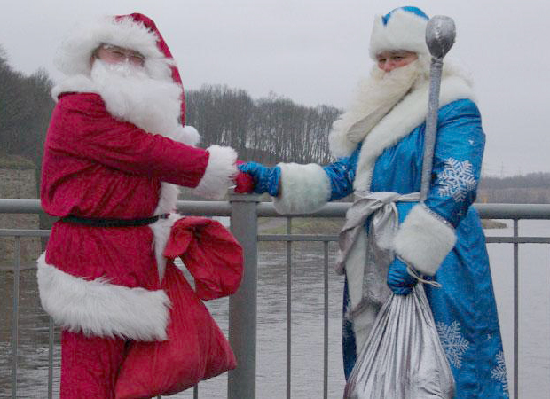 На приграничном мосту "Дружба", соединяющем эстонскую Нарву и российский Ивангород, 27 декабря 2012 года состоялась традиционная предновогодняя встреча Дед Мороза и Санта-Клауса.