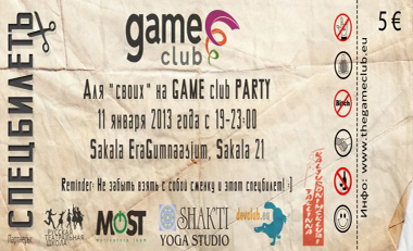 Таллинский GAME club открывает 2013 год уникальной вечеринкой для своих GAME club Party, которая состоится 11 января. В преддверии Старого Нового года GAME club и D.J. Горбачев представляют новый формат мероприятий - безалкогольные дискотеки для адекватных людей. Коллективным танцам будут предшествовать веселые интеллигентные игры на знакомство и создание приятной дружеской атмосферы.