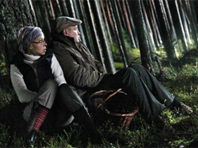 Дебютный фильм Тоомаса Хуссара «По грибы» (на фото - кадр из фильма) рассказывает о высокопоставленном государственном чиновнике, который вместе с женой и случайно прибившимся к ним рокером попадает из городской среды в дикую природу.