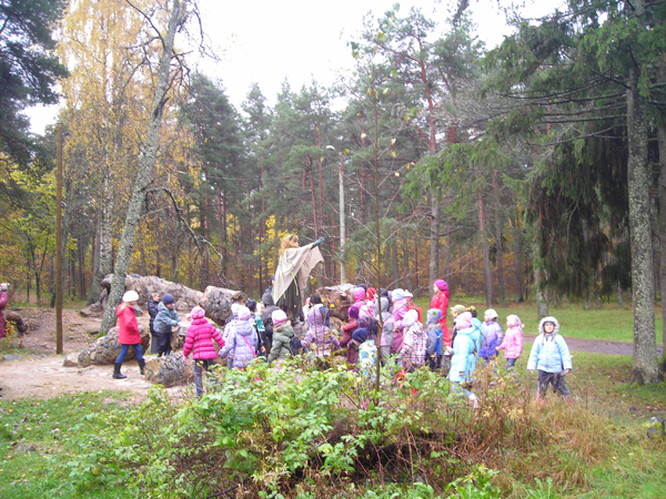 Настоящая, зелёная лесная Кикимора ждала детей, сидя на пеньке, рядом с огромной каменной фигурой хозяина парка – Калевипоэга. Она угощала детей клюквой, показывала какие деревья и кустарники растут в наших лесах, водила по своим владениям. Дети исследовали лес, держась за нити волшебных клубочков – путеводителей. Сказочная башня, куда они привели, оказалась обсерваторией, у каменного крокодила было обнаружено две пасти, вокруг фигуры хозяина леса можно было водить хороводы, а в каменной галерее детей ждало настоящее осеннее угощение-каравай и витаминный напиток. Даже дождик от удивления на время прекратился, а на небе открылось голубое оконце откуда выглянуло солнышко, когда довольные первоклассники возвращались в школу.