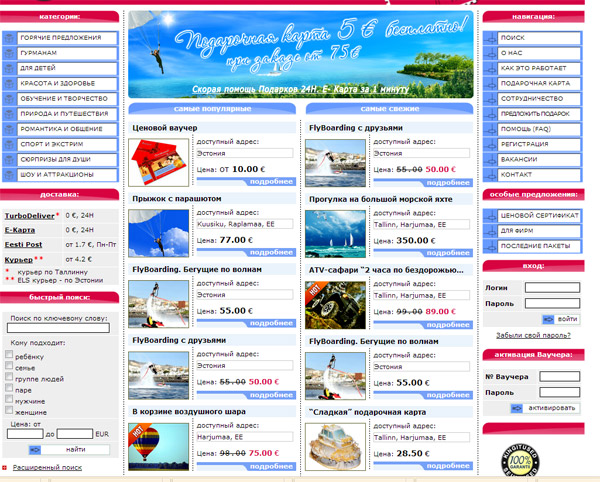 Seiklused.ee – это портал подарков и приключений, лидер в области содействия по преобретению услуг индустрии отдыха и развлечений в Эстонии. Каталог всех доступных на данный момент услугах отдыха и развлечений, которые вы можете приобрести себе или же как подарок для своих близких, возлюбленных, друзей.