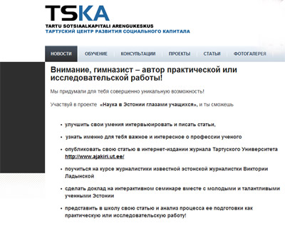 Тартуский Центр развития социального капитала в сотрудничестве со Школой наук Тартуского университета осуществляет два проекта Виктории Неборякиной в которых могут принять участие ученики школ Эстонии с русским языком обучения.