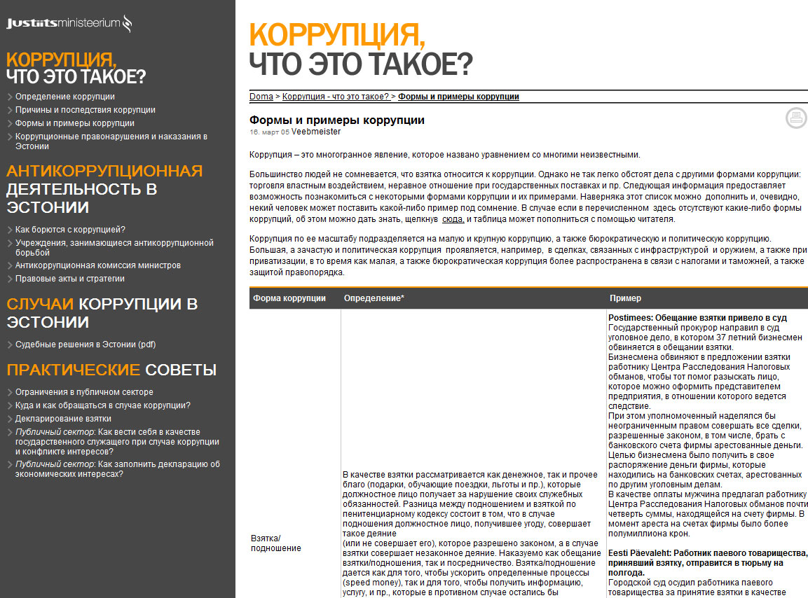 Министерство юстиции Эстонии объявило конкурс для выделения гранта на претворение в жизнь действий, направленных на повышение осведомленности русскоязычного населения о коррупции. Общая сумма гранта составляет 8000 евро.