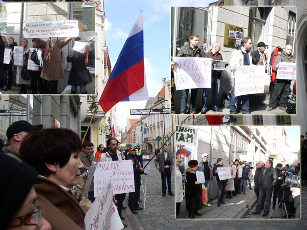 Люди стояли у входа в посольство РФ со стороны улицы Пикк с лозунгами «Нет двойным стандартам!», «Россия, мы с тобой!», «Помоями Европы и Америки Россию не испачкать!». Всем желающим раздавались георгиевские ленточки.