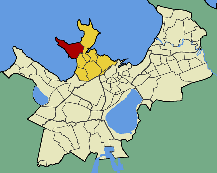 На схеме жёлтым цветом обозначен район Пыхья-Таллин, а красным - его часть под названием Копли. Коплинские линии расположены в самой левой нижней его части - на берегу моря.