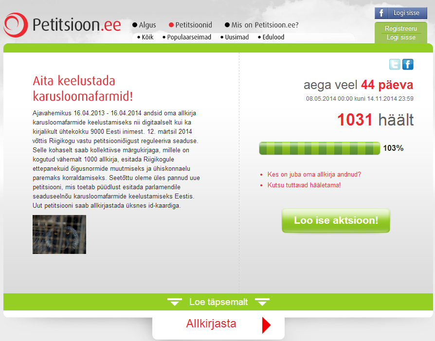 В апреле сего года была закрыта петиция, под которой свои подписи для запрета звероводческих ферм как по эл. почте, так и письменно поставили в общей сложности 9000 жителей Эстонии. Так как 12 марта 2014 вступил в силу закон, регулирующий петиционное право, на основании которого подписанным не менее 1000 людьми меморандумом можно подавать Рийгикогу предложения для изменения закона, то в мае месяце Loomus выставил новую петицию, которую можно было подписать только при помощи ИД-карты.