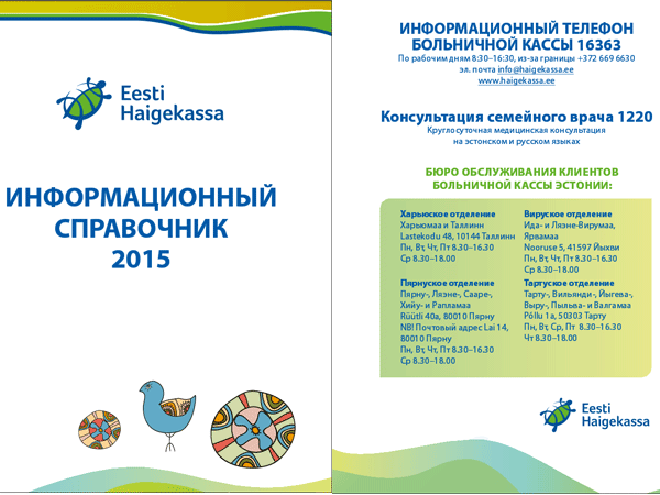 Эстонская касса медицинского страхования в 2015 году впервые выпустила информационный справочник, знакомящий с системой медстрахования и здравоохранения Эстонии не только на эстонском, но и на русском языке.