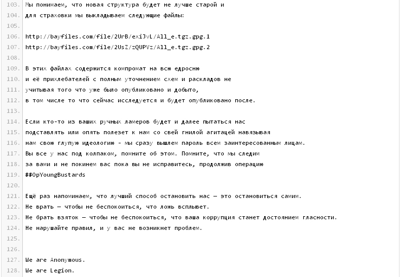 Представители российского крыла движения Anonymous выступили вечером 14 февраля с угрозой раскрыть компромат на членов партии «Единая Россия». Ссылку на текст обращения хакеры разместили в своем микроблоге на Twitterе. В сообщении Anonymous опубликовали ссылки на архив, защищенный паролем. По их словам, в нем находится компромат «на всю едросню и их прихлебателей», содержащий «полное уточнение схем и раскладов». Архивы являются подстраховкой на случай, если будет создана новая организация, дублирующая функции Росмолодежи, говорится в записи.