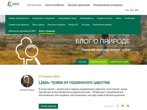 В блоге публикуются свежие новости о происходящем в лесах Эстонии, о представителях флоры и фауны. В нем рассказывается и о тех представителях животного мира, которых удалось зафиксировать в реальном времени видеокамере RMK, установленной на острове Сааремаа для наблюдения за благородными оленями. На русский язык переводятся заметки биолога и фотографа-природоведа Тийта Хунта, который известен как организатор знаменитого ежегодного фотоконкурса «Бескровная охота».