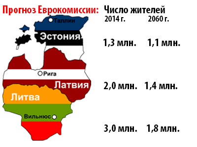 По оценкам прогноза демографической ситуации в Европе на срок до 2060, опубликованного Еврокомиссией, в последующие 50 лет Литва и Латвия будут лидерами по вымиранию населения среди стран ЕС: количество жителей этих прибалтийских республик сократится на 38% и 30% соответственно. Так, в Латвии численность населения к 2060 году уменьшится с нынешних 2 до 1,4 млн. человек. В свою очередь в Литве количество жителей снизится с нынешних 3 млн человек до 1,8 млн. Наименьшие, однако не менее катастрофичные, масштабы депопуляции среди Прибалтийских республик будет демонстрировать Эстония, численность населения которой сократится с 1,3 млн до 1,1 млн человек.