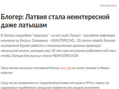 В Латвии очередная "перемога" - из неё ушёл Лукойл - последняя нефтяная компания из России. Основание - НЕИНТЕРЕСНО... По этому поводу должна состояться бурная радость и многочисленные оргазмы правящей латышской элиты, которая уже 30 лет круглосуточно работает над тем, чтобы Латвия для русских стала НЕИНТЕРЕСНОЙ. Такое мнение высказал популярный блогер Сергей Васильев seva_riga на своей странице в Живом журнале.