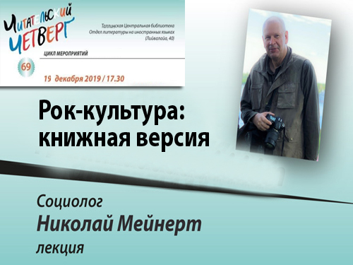 19 декабря 2019 года в 17.30 в отделе литературы на иностранных языках Таллинской Центральной библиотеки (ул. Лийвалайа, 40) состоится встреча на тему «Рок-культура: книжная версия» с социологом и публицистом Николаем Мейнертом.Речь пойдет о книгах русских и зарубежных авторов последних лет, которые пытаются описать и объяснить особенности развития рок-культуры.