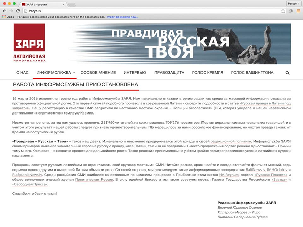 Представлявшая интересы русских жителей Латвии информационная служба «Заря» (http://zarya.lv), работавшая под девизом «Правдивая – Русская – Твоя», объявила о прекращении своей работы.