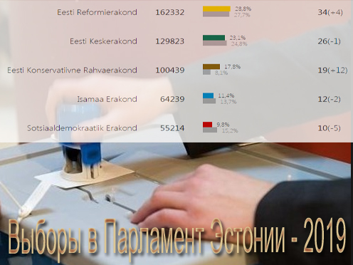3 марта 2019 года в Эстонии прошли выборы в парламент Эстонии XIV созыва. Больше всех голосов, как и на прошлых выборах в 2015 году, собрала Партия Реформ за которую проголосовали 28,8% из числа принявших участие в выборах. Центристская партия сохранила за собой вторую позицию, набрав 23,1% голосов, а на третье место вышли резко набравшие популярность среди населения страны националисты из Консервативной Народной партии, получившие поддержку 17,8% избирателей. Также в парламенте будут представлены партия "Отечество" (11,4%) и Социал-Демократическая партия Эстонии (9,8%).